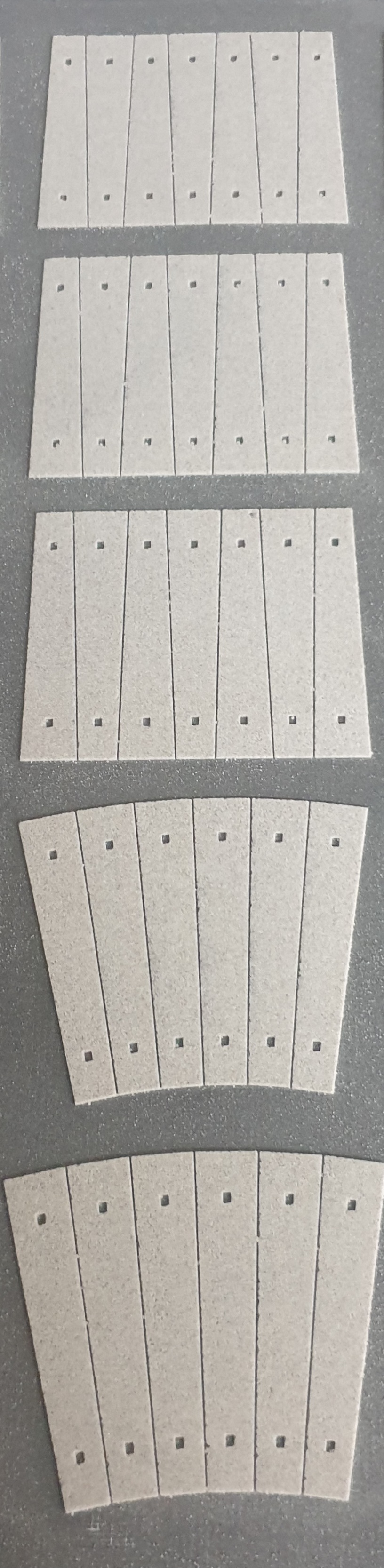 Die trapezförmigen Zusatzelemente bieten Ihnen die Möglichkeit Kurven und Abzweigungen wirklichkeitsnah darzustellen. Die Trapezplatten können außerdem als Füllstücke für Gleise an Bahnübergängen genutzt werden. Auf den Trapezplatten können Sie nun mittels handelsüblichen Acryl- und Dispersionsfarben Verwitterungen oder zwischen den einzelnen Fugen mit unserer Reparatur-Sandsteinpaste (Art.-Nr. 990400) in der Farbe grün Unkraut und Moosablagerungen abbilden. So gestalten Sie auf einfache Art und Weise eine schöne alte Trapezplattenstraße. Die Trapezplatten können beliebig verlängert werden und sollten die Übergänge mal nicht gelungen sein dann können sie mit unserer Reparatur-Sandsteinpaste in der gleichen Farbe ausgeglichen werden. Durch Wärmezufuhr wird die Matte flexibel und kann so mit einem Cuttermesser geschnitten und bearbeitet werden. Die Verklebung der Trapezplatten erfolgt mit unserem im System erprobten Mattenkleber (Art.-Nr. 990100) im gleichen Farbton oder im Innenbereich mit handelsüblichen Weißleim.
