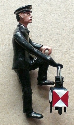 Die Figur hat ein angewinkeltes Bein und beide Arme sind beweglich um den Rangierer optimal auf vielen Loktritten und Wagenbühnen zu platzieren. Die Lampe ist nicht beleuchtet.