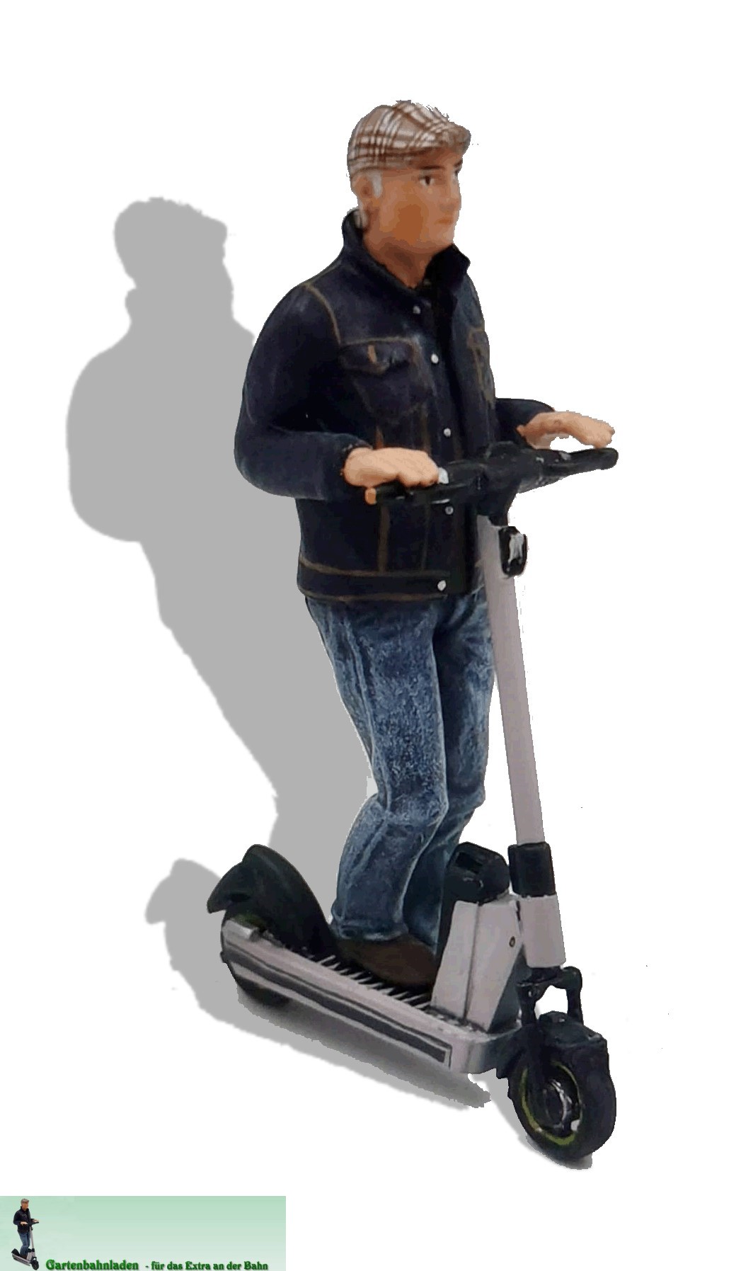 Aus dem heutigen Stadtverkehr nicht mehr wegzudenken. Personen auf E-Rollern. Ob Eigentum oder geliehen gehören diese Flitzer zu unserer modernen Zeit. Die vorbildnahen Figuren, passend zur Gartenbahn, sind aus Metall mit UV resistenten Farben handbemalt.