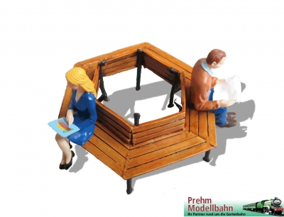 Das Modell einer Rundbank kann, z.B. einen Baum, eine Lampe oder eine Litfaßsäule umschließen. Das Modell für die Gartenbahn, aus Metall, ist mit UV beständigen Farben bemalt und ist somit Wetterfest und für den Außenbereich geeignet.
