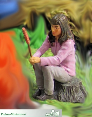 Art.-Nr. 500214 - Camperin mit Bratwurst auf Baumstumpf sitzend