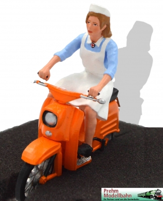 Zu DDR Zeiten hatte jedes Dorf eine Gemeindeschwester, welche die Aufgabe hatte in allen Lebenssituationen, den Bürgern zu helfen, so weit es möglich war. Mit dem Moped „Schwalbe“ fuhr sie zu den Bürgen die Hilfe brauchten, ob medizinisch oder seelisch. Lange Zeit lief eine Serie im DDR Fernsehen, die verschiedene Situationen beschrieb, vom Einsatz der Gemeindeschwester. Fein detailliertes Metallmodell mit UV resistenten Farben
