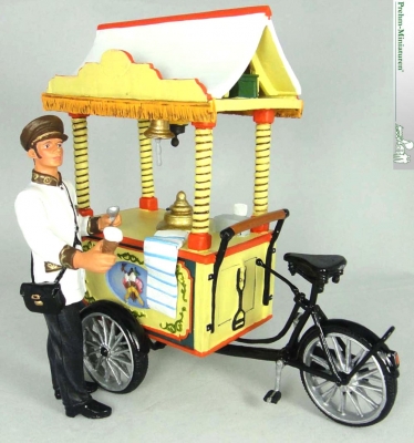 So auch das gute italienische Eis, „Gelato“. Verschiedene Methoden wurden praktiziert um das exzellente Speiseeis, an den Mann, bzw. an das Kind zu bringen. Eine solche Variante war der Wagen, der vom Eisverkäufer mit einem Fahrrad bewegt wurde. In einer typischen Arbeitskleidung für den „Eismann“ fuhr er durch die Straßen und kündigte mit einer Glocke seine Anwesenheit an.