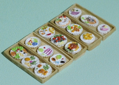 Set besteht aus 15 Tellern - Speisen: z.B. Jäger-Schnitzel mit Pommes und Salatbeilage, Spiegelei mit Würstchen und Salat, Fisch mit Kartoffeln und Gemüse, Aubergine mit Brötchen, Rohkost mit Salat.