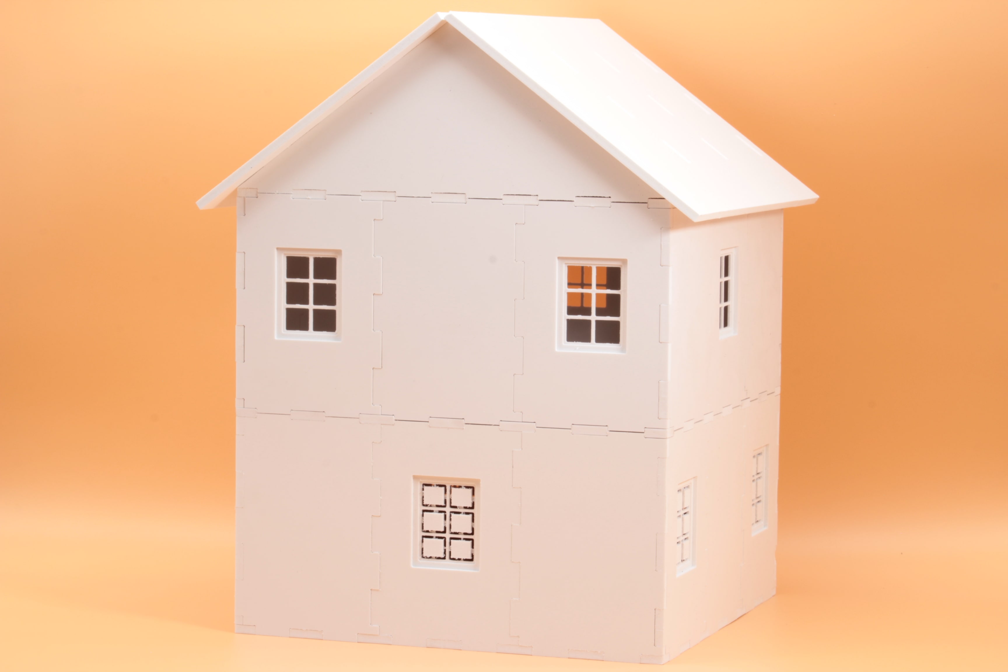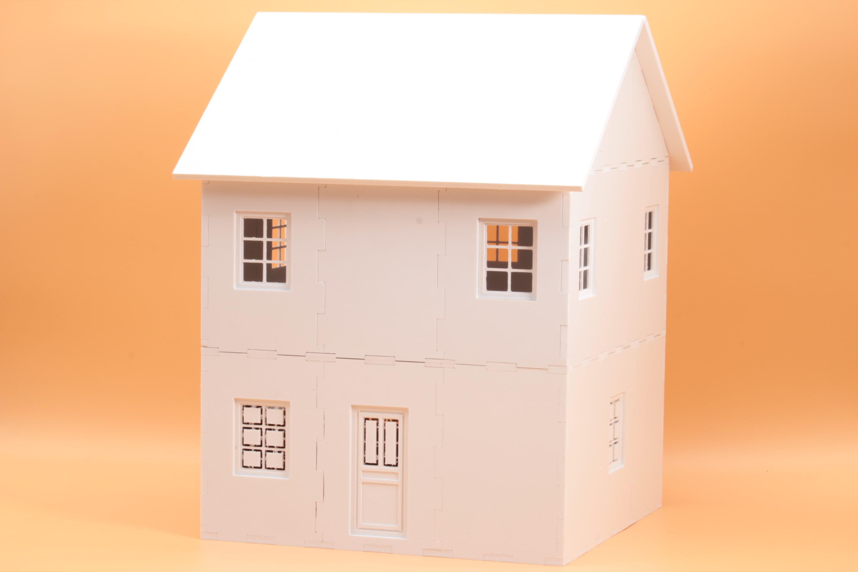 Das Haus Baabe ist ein fertiger Rohbausatz, in dem die Fenster und die Tür direkt in die einzel Teile eingefräst sind.